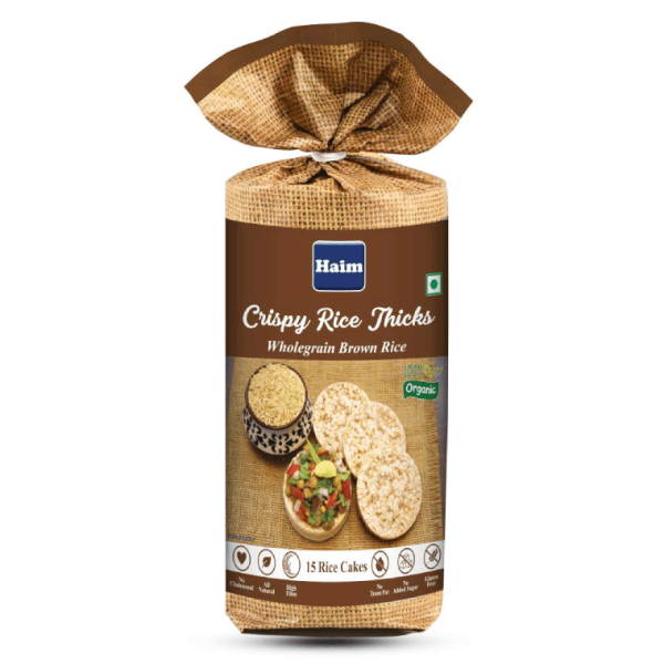 • All Natural Haim Crispy Rice Thicks Wholegrain Brown Rice Cakes are 100% Organic, High Fibre, ultra low fat, and Gluten Free. They have No Cholesterol, No Preservatives, No Hydrogenated Oils ( No Trans Fat ), and No Sugar. Perfect for Guilt Free and diet-friendly Snacks for all ages.