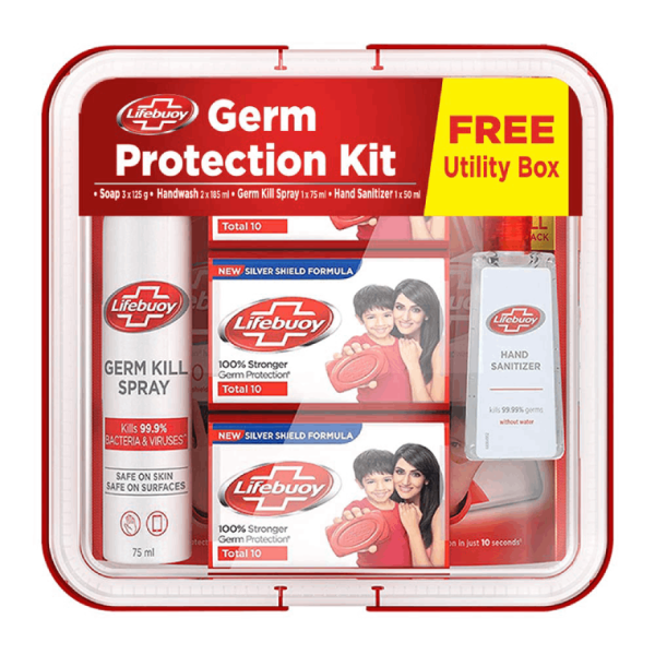 • Lifebuoy Germ Protection Kit includes, Lifebuoy Total 10 Soap (125g x 3) , Lifebuoy Total 10 Handwash Pouch (185 ml x 2), Lifebuoy Total 10 Sanitizer Gel (50 ml x 1) & Lifebuoy Germ Kill Spray (75 ml x 1)
