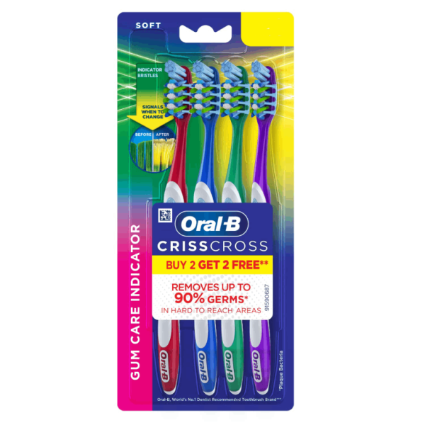 • Angled at 15° in opposing directions, CrissCross bristles are designed to flex and then straighten, actively penetrating between the teeth and along the gum line to lift and sweep plaque away