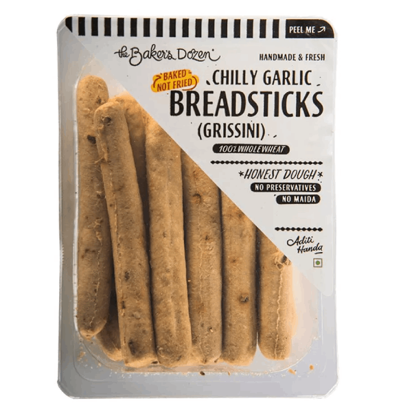 These are 100% Wholewheat breadsticks with no maida and with an added dash of chilli and garlic, these are the perfect side for your soups, sauces or dips! No preservatives.