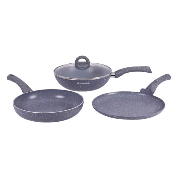 Enhance your cooking and dining experience with the most popular Wonderchef Granite cookware range. The granite finish gives the aluminum cookware a stylish and modern look. Wonderchef Granite Set includes a large-sized 26cm Wok, Fry Pan & Dosa Tawa with a common lid, thus providing a complete cooking solution for healthy and low-fat home-cooked meals. Finest non-stick coating for healthy, low-fat, and delicious meals.
